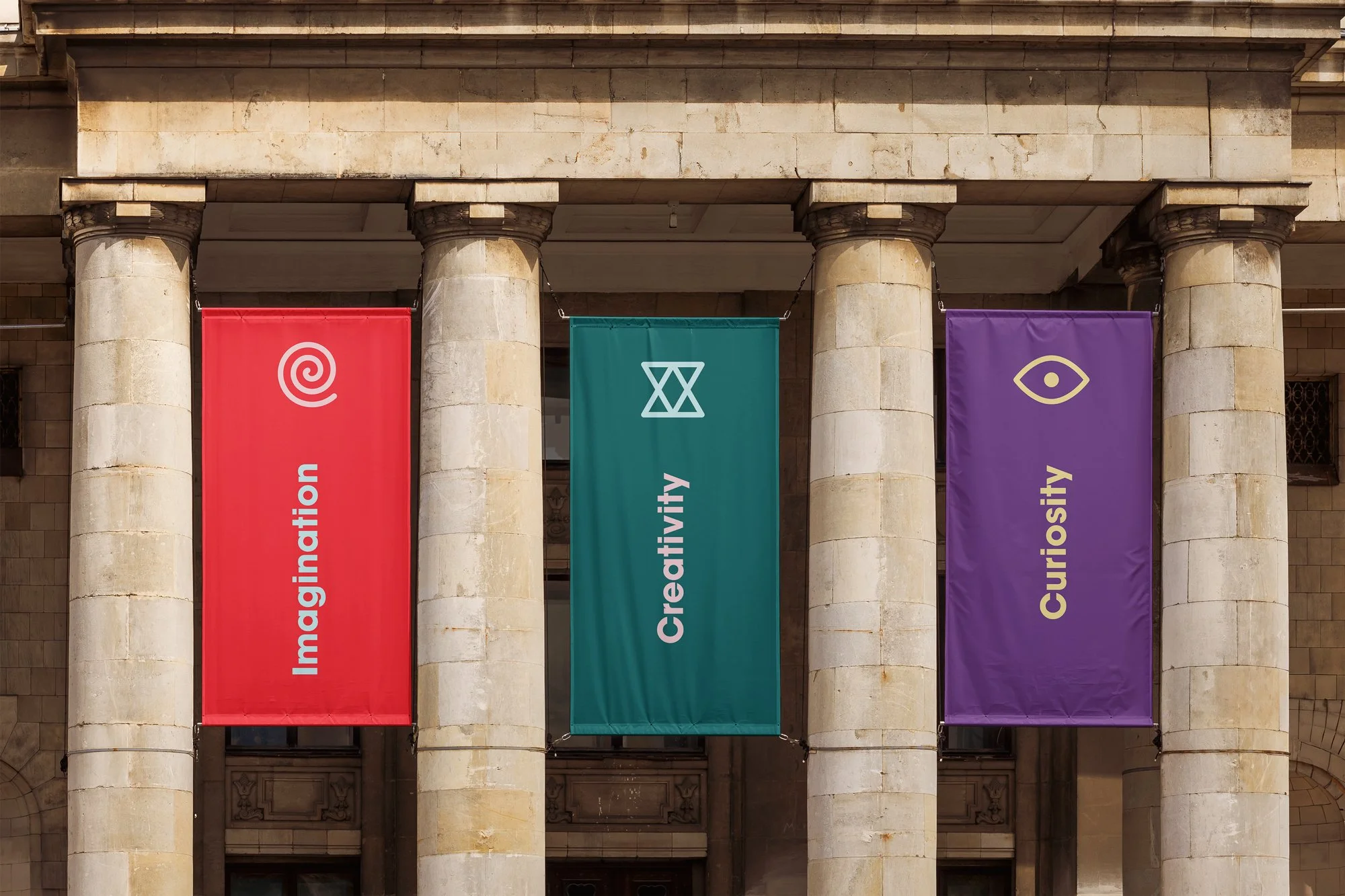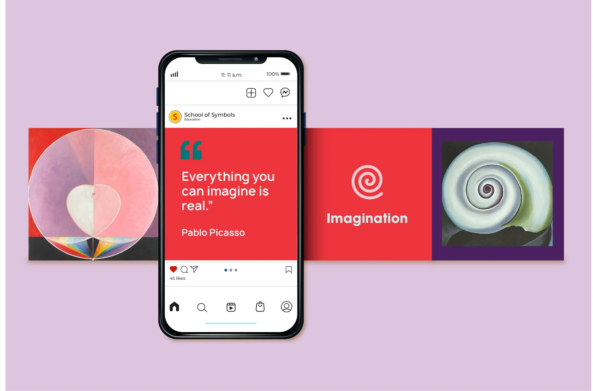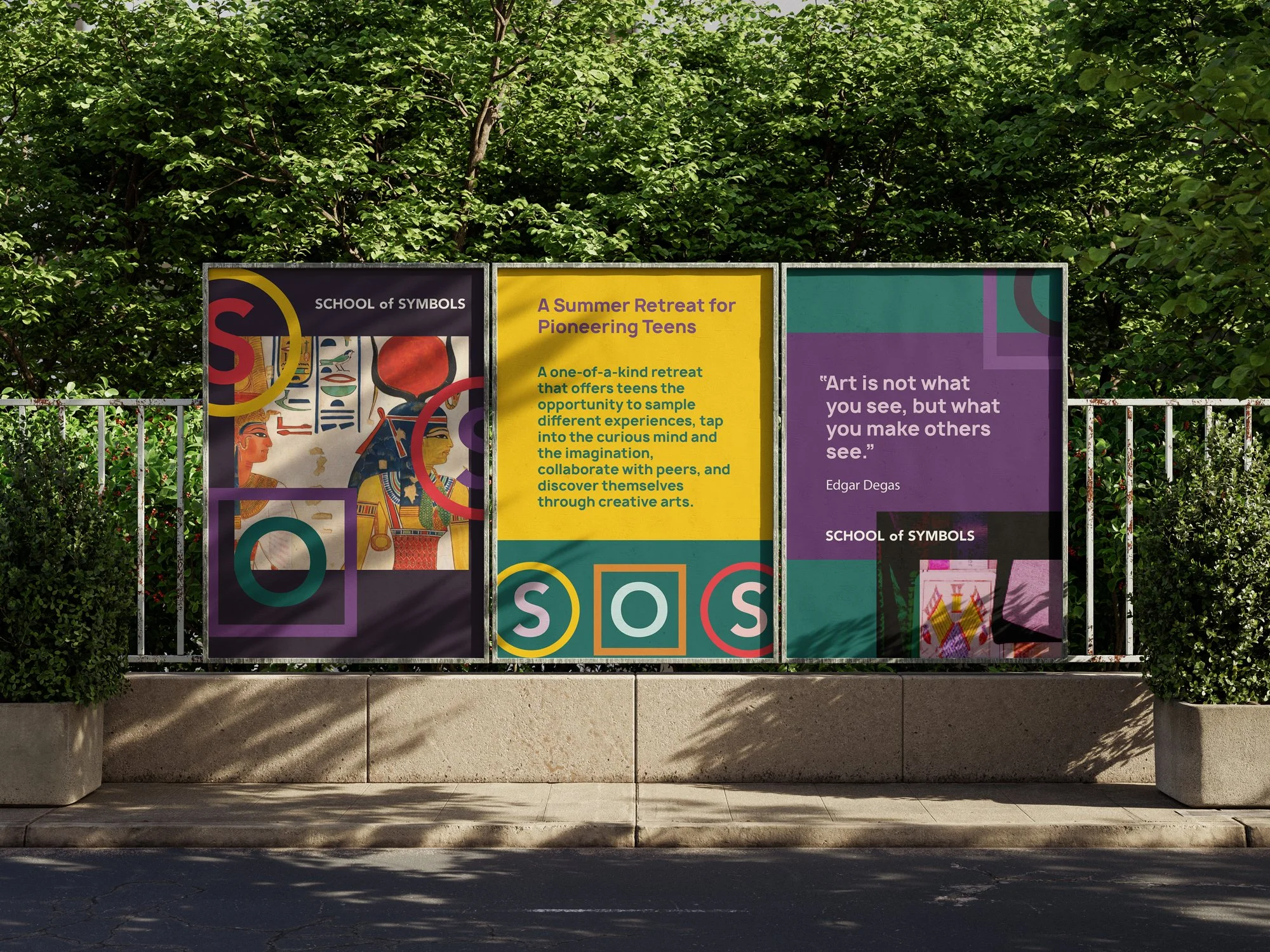 SoS needed a bold identity that would appeal to its audience. The approach was inspired by a modern museum aesthetic. The identity design is rooted in the simplicity of basic shapes which can be used as a window, a holding space, or a backdrop to the rich and artistic symbols that are explored by students.